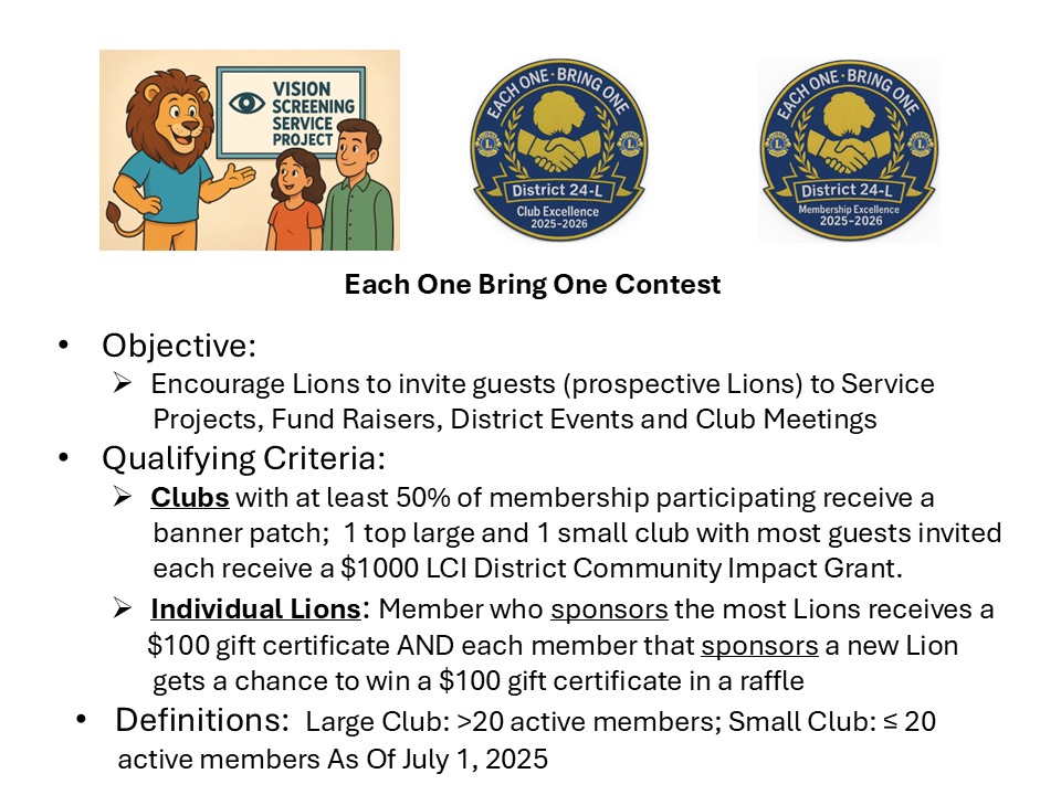 This club-level membership award supports Mission 1.5 -- the global goal to reach 1.5 million Lions worldwide. We are asking every member to bring a prospective Lion to a club meeting, service project, or fundraiser. There will be two awards of $1,000 each (one for a club with fewer than 20 members and one for a club with 20 or more members).